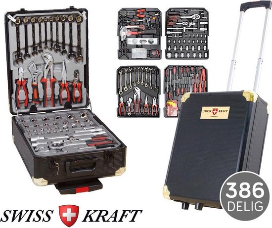 De gereedschapstrolley heeft 4 inlays die stapelbaar zijn, waardoor je gemakkelijk al je gereedschap georganiseerd kunt opbergen en meenemen. De set bevat een breed scala aan gereedschap, zoals schroevendraaiers, tangen, sleutels, boren en bits. Daarnaast is de gereedschapstrolley voorzien van stevige wielen en een uitschuifbaar handvat, waardoor je hem moeiteloos kunt verplaatsen naar elke werklocatie. De koffer is gemaakt van hoogwaardig materiaal en heeft een robuust ontwerp, zodat al je gereedschap veilig en beschermd blijft. Met de Swiss Kraft gereedschapstrolley ben je altijd goed voorbereid en kun je elke klus met vertrouwen tegemoet gaan.