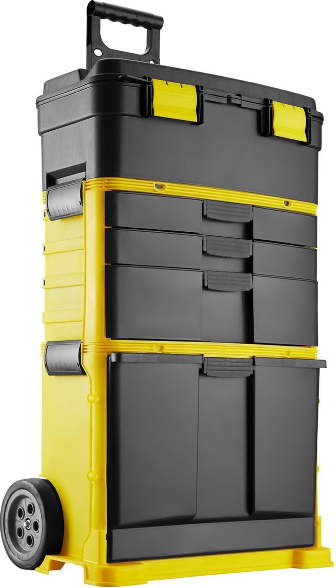 De trolley is gemaakt van stevig plastic en heeft een opvallende gele kleur, waardoor hij niet alleen functioneel is, maar ook nog eens een vrolijke toevoeging is aan je werkruimte. Met afmetingen van 48 x 26 x 74 cm biedt deze gereedschapstrolley voldoende ruimte voor al je gereedschap en materialen, waardoor je alles georganiseerd en binnen handbereik kunt houden tijdens het klussen of werken. Daarnaast is de trolley voorzien van handige details zoals een uittrekbare greep en lichtlopende wielen, waardoor hij gemakkelijk te verplaatsen is, zelfs als hij volgeladen is. Of je nu een professionele klusser bent of gewoon wat meer orde wilt creëren in je hobbyruimte, deze gereedschapstrolley van tectake is de ideale oplossing voor al je opbergbehoeften. Met zijn slimme indeling en praktische ontwerp maakt hij het gemakkelijk om georganiseerd te werken en snel toegang te hebben tot al je gereedschap.