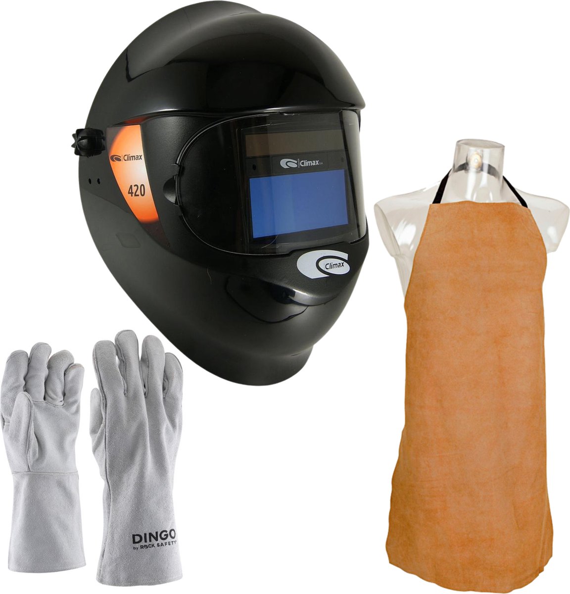 Deze complete set bevat alles wat een lasser nodig heeft om veilig en comfortabel te werken. De Climax laskap 420 biedt optimale bescherming tegen vonken en spatten, terwijl het lichtgewicht ontwerp zorgt voor een prettige draagervaring. De lasschort en lashandschoenen zorgen ervoor dat de kleding en handen van de lasser beschermd zijn tegen hitte en vuil. De laskleding in deze set is gemaakt van hoogwaardige materialen die duurzaam en slijtvast zijn. De laskap heeft een handige instelbare hoofdband en een groot kijkvenster voor een goed zicht op het werkstuk. Met deze complete set kan elke lasser veilig en efficiënt aan de slag, zonder zich zorgen te hoeven maken over zijn of haar veiligheid.