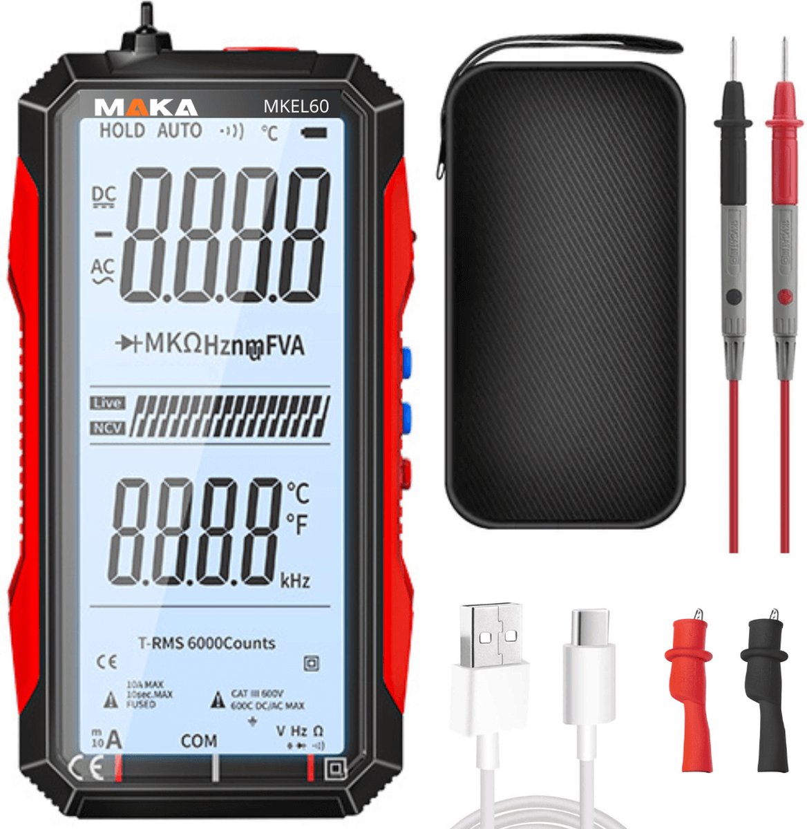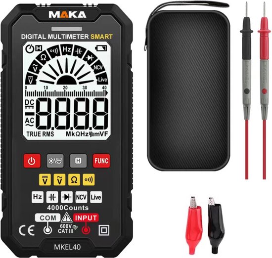 Met zijn grote display met 4000 counts en True RMS-functie biedt de MAKA multimeter nauwkeurige metingen in verschillende situaties. De True RMS-functie zorgt ervoor dat je zelfs nauwkeurige metingen kunt uitvoeren bij niet-lineaire signalen, wat essentieel is voor professionele elektriciens en hobbyisten. Bovendien heeft deze multimeter een compact en ergonomisch design, waardoor hij gemakkelijk te gebruiken is, zelfs in krappe ruimtes. De MAKA multimeter wordt geleverd met een handige draagtas en een set meetkabels, zodat je direct aan de slag kunt gaan. Of je nu thuis aan het klussen bent of op locatie werkt, met de MAKA digitale multimeter ben je altijd voorbereid. Bestel vandaag nog en ontdek zelf het gemak en de nauwkeurigheid van deze betrouwbare multimeter!