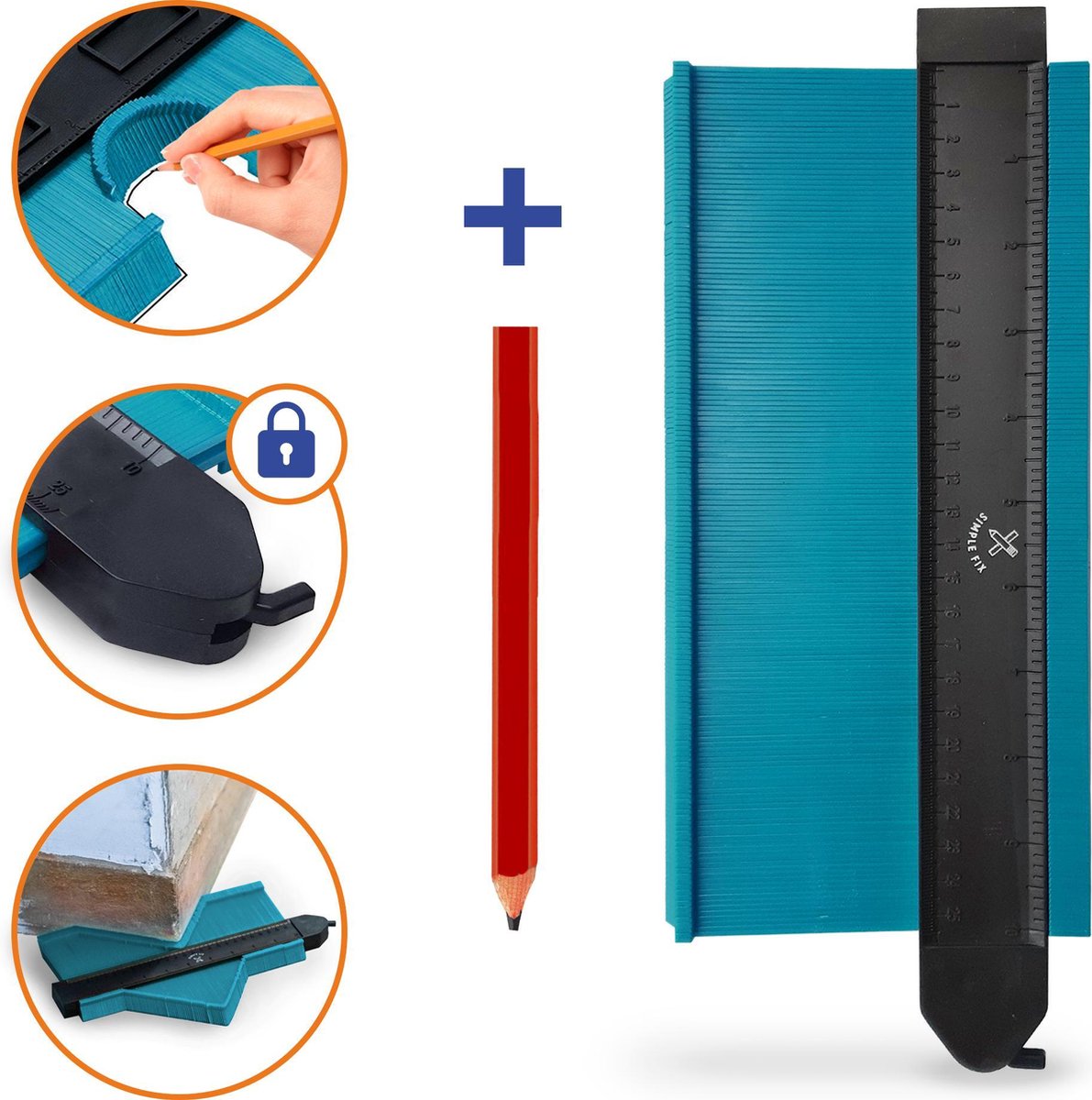 De Simple Fix Aftekenhulp is een handig gereedschap voor elke klusser. Met zijn 25cm x 5cm formaat en groene kleur is deze aftekenhulp gemakkelijk te herkennen en te gebruiken. Met de lock en het meegeleverde timmermanspotlood kun je nauwkeurig en precies profielen en contouren overnemen op verschillende materialen, zoals laminaat. Deze veelzijdige aftekenhulp kan gebruikt worden als profielaftaster, profielmal, profielmeter en contourmal. Door zijn compacte formaat is hij gemakkelijk mee te nemen en op te bergen in je gereedschapskist. De Simple Fix Aftekenhulp is een onmisbaar hulpmiddel voor elke doe-het-zelver en professional die op zoek is naar precisie en efficiëntie bij het markeren en aftekenen van materialen. Met deze aftekenhulp wordt elke klus een stuk eenvoudiger en nauwkeuriger uitgevoerd.