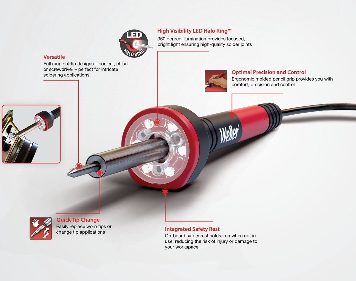 De Weller WLIR6023C soldeerbout met LED verlichting is ontworpen voor precisiewerk en langdurig gebruik. Dankzij de LED Halo Ring™ rondom de soldeerpunt heeft u altijd goed zicht op het soldeerwerk, zelfs in donkere ruimtes. De ergonomische potloodgreep zorgt voor comfortabel en nauwkeurig werken, terwijl de makkelijk vervangbare soldeerpunten ervoor zorgen dat u altijd kunt blijven solderen zonder onderbrekingen. Met een maximale temperatuur van 425°C kunt u moeiteloos verschillende soorten materialen en componenten solderen. De ingebouwde veiligheidshouder zorgt ervoor dat u de soldeerbout veilig kunt neerzetten wanneer deze niet in gebruik is. Of u nu een beginner bent of een ervaren professional, de Weller WLIR6023C soldeerbout met LED verlichting is de ideale keuze voor al uw soldeerklussen.