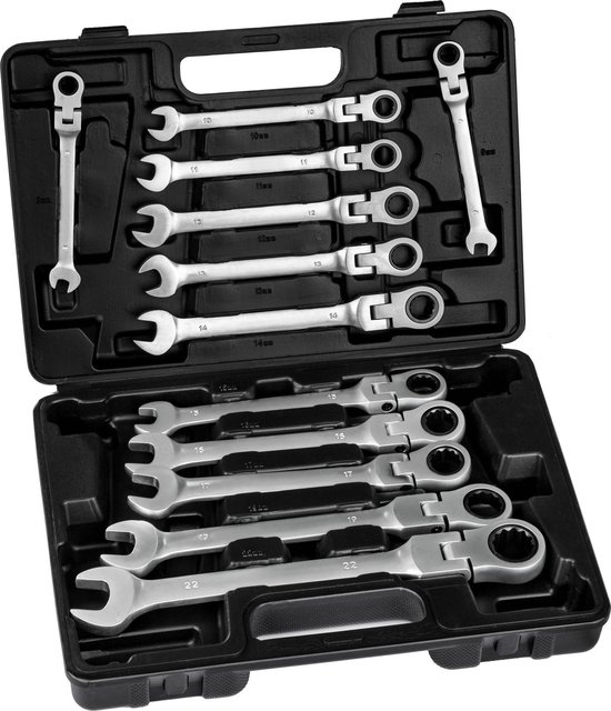 Met deze steeksleutelset van TecTake heb je altijd het juiste gereedschap bij de hand voor elke klus. De flexibele scharnierkoppen maken het mogelijk om zelfs op de meest lastige plekken te werken, waardoor geen bout of moer meer onbereikbaar is. De set bevat sleutels in verschillende maten, waardoor je altijd de juiste maat bij de hand hebt. Het chroom vanadium-staal waarvan de sleutels gemaakt zijn, zorgt voor een lange levensduur en duurzaamheid. De stabiele kunststof koffer zorgt ervoor dat je de set gemakkelijk kunt opbergen en vervoeren, zodat je altijd georganiseerd te werk kunt gaan. Of je nu een ervaren professional bent of een enthousiaste doe-het-zelver, met deze steeksleutelset van TecTake ben je altijd goed uitgerust voor elke klus.